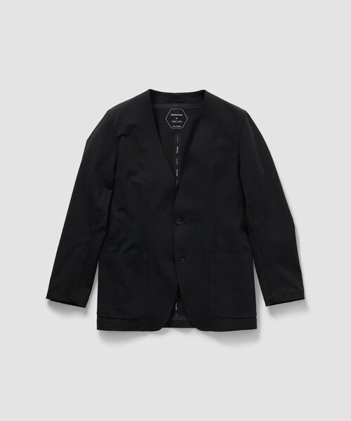 随所にシームテープを配し、ツヤ消しブラックのメタル釦を採用。直線的なディテールで構成することで、ミニマルかつクリーンな印象に仕上げています。